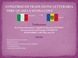 Departamentul de Traducere Interpretare și Lingvistică Aplicată în colaborare cu Societatea Dante Alighieri Comitetul din Chișinău au petrecut a treia ediție a concursului de traducere literară din limba italiană în limba română Dire quasi la stessa cosa la data de 28 decembrie 2024 ora 11:00 sala 128,  Centrul de Limbă și Civilizație Italiană „Ion Dumbrăveanu”.