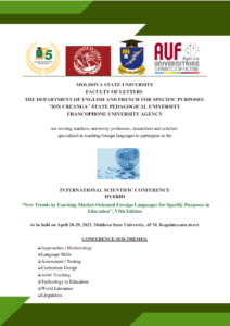 invites you to participate in the International Scientific Conference (Hybrid) “New Trends in Teaching Market-Oriented Foreign Languages for Specific Purposes in Education”, VIth Edition, which will take place on the 28-29th of April, 2023.