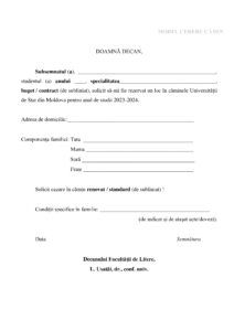 Studenții anului I pot solicita un loc în căminele USM pe perioada anului academic 2023-2024, expediind anexat o cerere și documentele specificate în modelul de cerere pe adresa litere@usm.md până la data de 27 august 2023.  Model cerere: camin cerere 2023