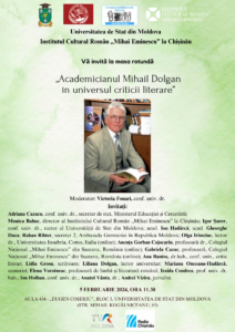 Masa rotundă „Academicianul Mihai Dolgan în universul criticii literare”. Evenimentul va avea loc pe 5 februarie 2024, la ora 11.30, sala 434 Centrul E.Coșeriu, blocul III.